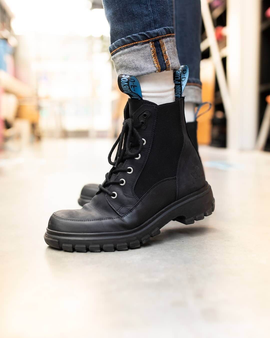 The two-tone lace-to-toe boot features a 5 eyelet pattern with 4 speedhooks, and is capped off with two lace options, black waxed cotton and leather Fluevog turquoise laces.